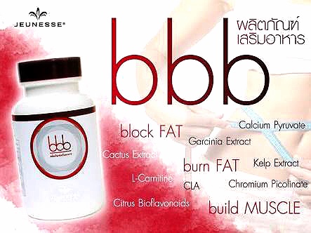 - bbb (Block Burn Build) เป็นผลิตภัณฑ์เสริมอาหารที่ช่วยในการควบคุมน้ำหนัก เป็นผลิตภัณฑ์คุณภาพจาก บริษัท เจอเนสส์ โกลบอล (ประเทศไทย) มีจำหน่ายเฉพาะในประเทศไทย โดยตัวแทนจำหน่ายที่ถูกต้องของบริษัทเท่านั้นค่ะ